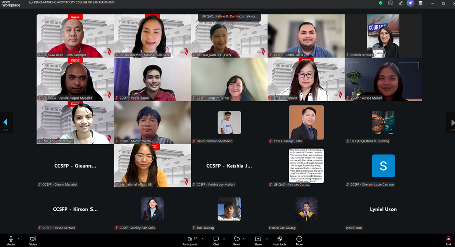 In its continued pursuit of excellence, global competitiveness, and quality assurance, the University of Baguio (UB), through its Quality Assurance Office (QAO), conducted a successful online benchmarking activity with the City College of San Fernando Pampanga (CCSFP) on March 27, 2026. The session, held via Zoom, brought together 25 participants, including 10 representatives from UB—comprising directors, deans, and key staff—and 15 delegates from CCSFP, fostering a dynamic exchange of institutional best practices and internationalization strategies.