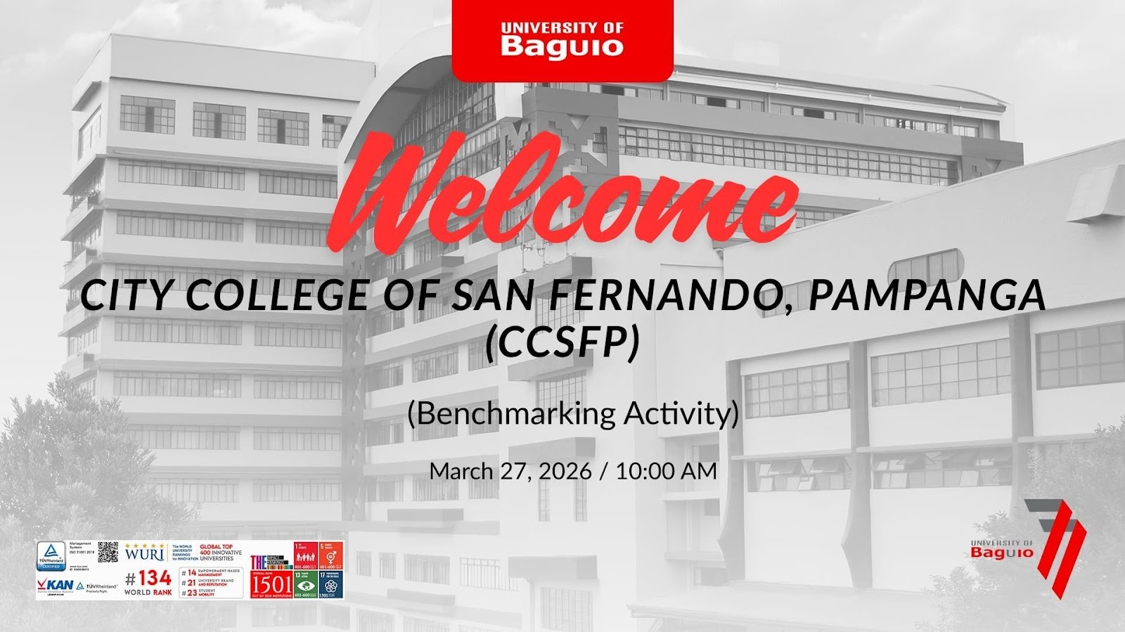 In its continued pursuit of excellence, global competitiveness, and quality assurance, the University of Baguio (UB), through its Quality Assurance Office (QAO), conducted a successful online benchmarking activity with the City College of San Fernando Pampanga (CCSFP) on March 27, 2026. The session, held via Zoom, brought together 25 participants, including 10 representatives from UB—comprising directors, deans, and key staff—and 15 delegates from CCSFP, fostering a dynamic exchange of institutional best practices and internationalization strategies.