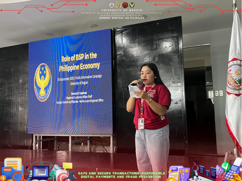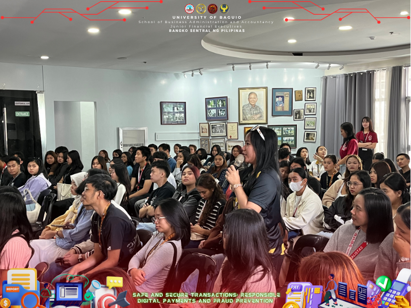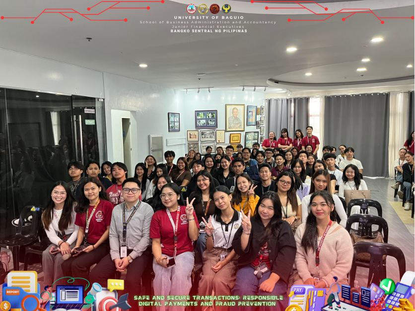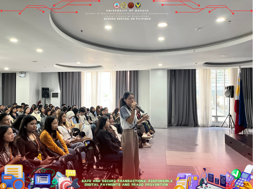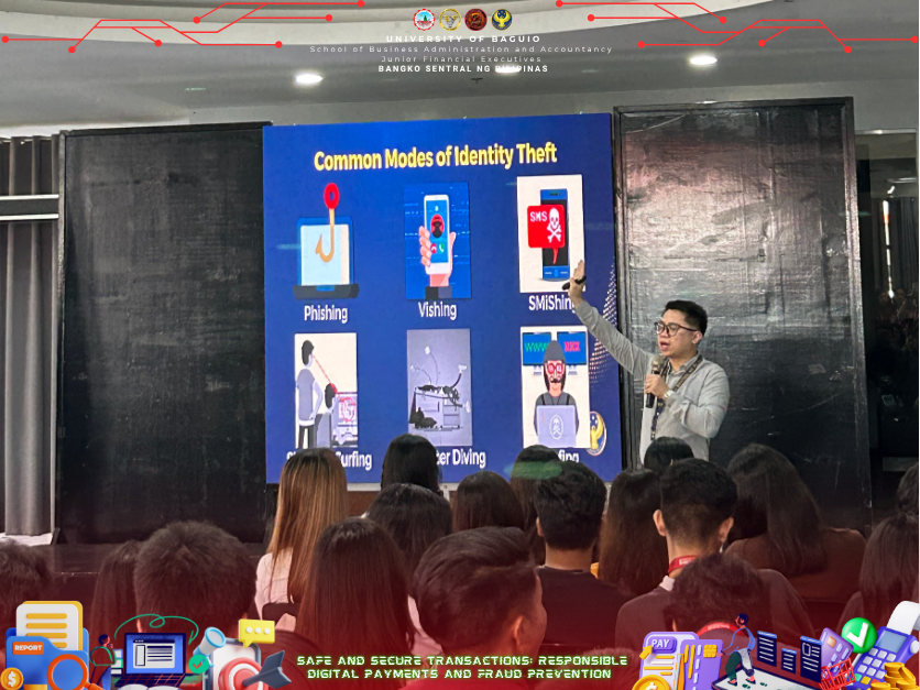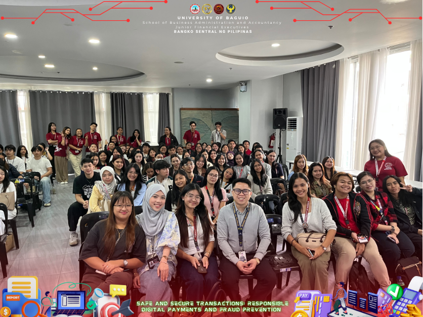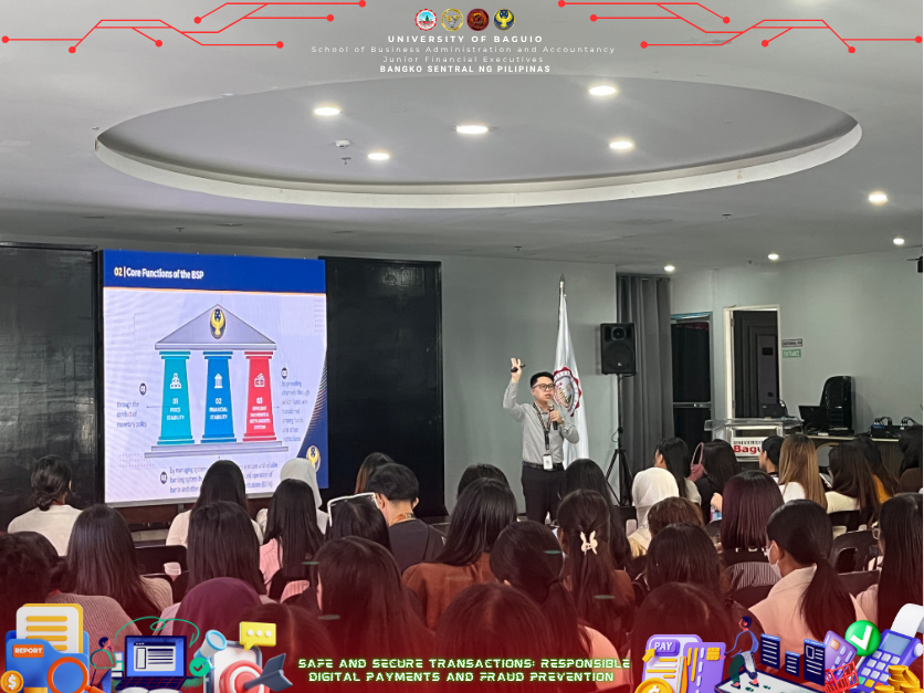 The Junior Financial Executives (JFINEX) of the School of Business Administration and Accountancy (SBAA) at the University of Baguio successfully conducted a seminar entitled “Safe and Secure Transactions: Responsible Digital Payments and Fraud Prevention” on September 30, 2025, at the Centennial Hall, University of Baguio. The event was established to give students an essential knowledge of digital finance and to increase awareness of cybersecurity, fraud prevention, and responsible digital payments, which are important abilities to have in a financial world that is becoming more and more digital and cashless. With the dedication of the university for high-quality education, the JFINEX organized the seminar to emphasize the value of digital financial literacy in fostering responsible digital transactions and trust in financial systems whereas the seminar doesn’t limit to as event but rather a step to make the financial management students be more familiarized in the financial world whether it is a physical or digital transactions.
