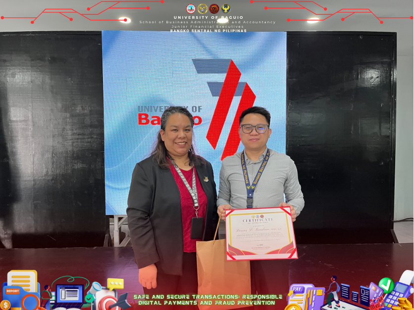 Overall, the “Safe and Secure Transactions: Responsible Digital Payments and Fraud Prevention” seminar reaffirmed the University of Baguio’s unwavering commitment to nurturing financially literate, ethically responsible, and digitally competent graduates. Through embedding sustainable development goals into its core objectives, this initiative not only empowered students with practical knowledge but also contributed to a broader mission of shaping socially aware, globally competitive individuals capable of thriving in a modern financial landscape. Moving forward, with the resounding successful event, the JFINEX organization is planning to collaborate again with BSP to deepen the financial education programs of the School of Business Administration and Accountancy.