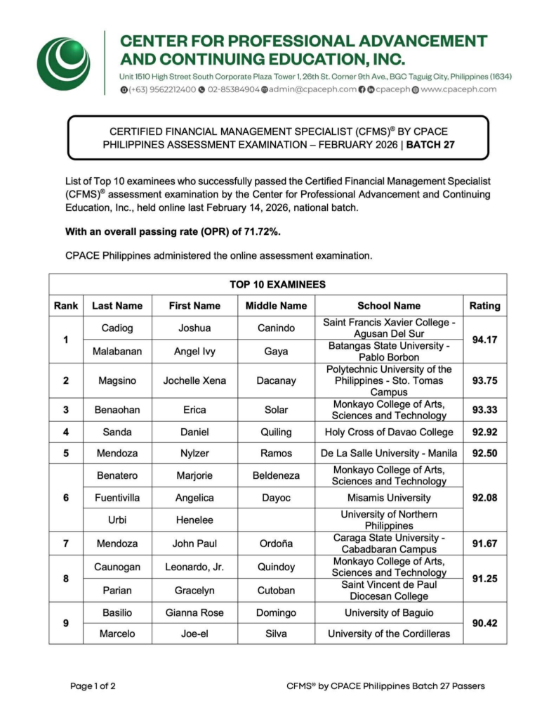 The University of Baguio School of Business Administration and Accountancy once again celebrates a remarkable achievement. A Financial Management student had success in the Certified Financial Management Specialist exam that took place in February 2026. This exam was organized by the Center for Professional Advancement and Continuing Education (CPACE).