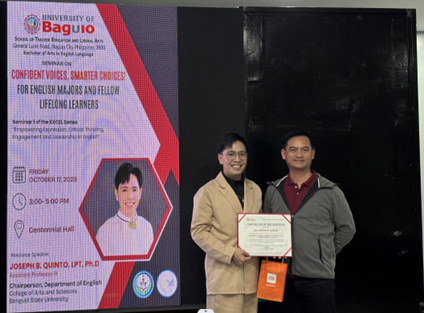 The BA English Language (BAEL) Program at the School of Teacher Education and Liberal Arts (STELA) kicked off its flagship EXCEL Series—Empowering Expression, Critical Thinking, Engagement, and Leadership in English with the seminar “Confident Voices, Smart Choices!” on October 17, 2025, at Centennial Hall. The series highlights BAEL’s ongoing commitment to developing competent, confident, and community-minded English majors who can excel as communicators, leaders, and lifelong learners. Dr. Joseph B. Quinto, LPT, Chairperson of the Department of English at Benguet State University, delivered an engaging lecture and interactive speaking exercises that provided students with practical ways to improve their communication competence and self-confidence. The program highlights cross-school collaboration and professional exchange through UB-BSU collaboration.